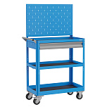 Корпус выполнен из листовой стали толщиной от 0,6 до 1,5 мм., покрыт полимерной порошковой краской. С перфорированной панелью для навесных элементов и выдвижным ящиком на шариковых телескопических направляющих. Общая равномерно-распределённая нагрузка на тележку - до 100кг. Верхняя и средняя полка имеют высоту борта 40 мм., нижняя полка имеет высоту борта 60 мм. Размер 950х800х450 мм.