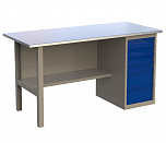 Однотумбовый. Допустимая нагрузка на столешницу 750 кг. Опорные элементы выполнены сварными из холоднокатаной стали. Верстак состоит из  опоры, тумбы P7 с дверью и двумя полками и полки-стенки. Все металлические элементы покрыты полиэфирной порошковой краской. Столешница состоит из фанеры марки ФСФ толщиной 24 мм, которая покрыта лаком-антисептиком и листом оцинкованной холоднокатаной стали толщиной 1,2 мм. Размеры (ВхШхГ) 855x1196x696 мм.