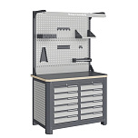 Нагрузка на столешницу 1500 кг. Столешница из листа влагостойкой фанеры марки ФСФ толщиной 40 мм и листом горячекатаной стали толщиной 5 мм. Рама верстака выполнена их холоднокатаной стали. Модуль верстака выполнен сварными. Ящики в модулях устанавливаются на шариковых телескопических направляющих полного выдвижения. Квадратная перфорация для установки крючков, держателей. Размеры: 1982x1493x743 мм.