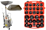 Комплект из TS-2085 маслосборник. Для быстрого слива и откачки щупами масла и антифриза из ДВС, КПП и мостов всех авто. В комплекте: Сливная чаша. Щупы гибкие 6 шт. Лоток для сливной пробки. Металлические пистолеты для откачки масла. Цифровая индикация уровня разрежения в установке. Обрезиненная ручка для транспортировки. Вмещает 90 л. = Бак 80л + сливная воронка 10л.  + ES0903 Набор съемников масляных фильтров ("чашки") - 30 шт.