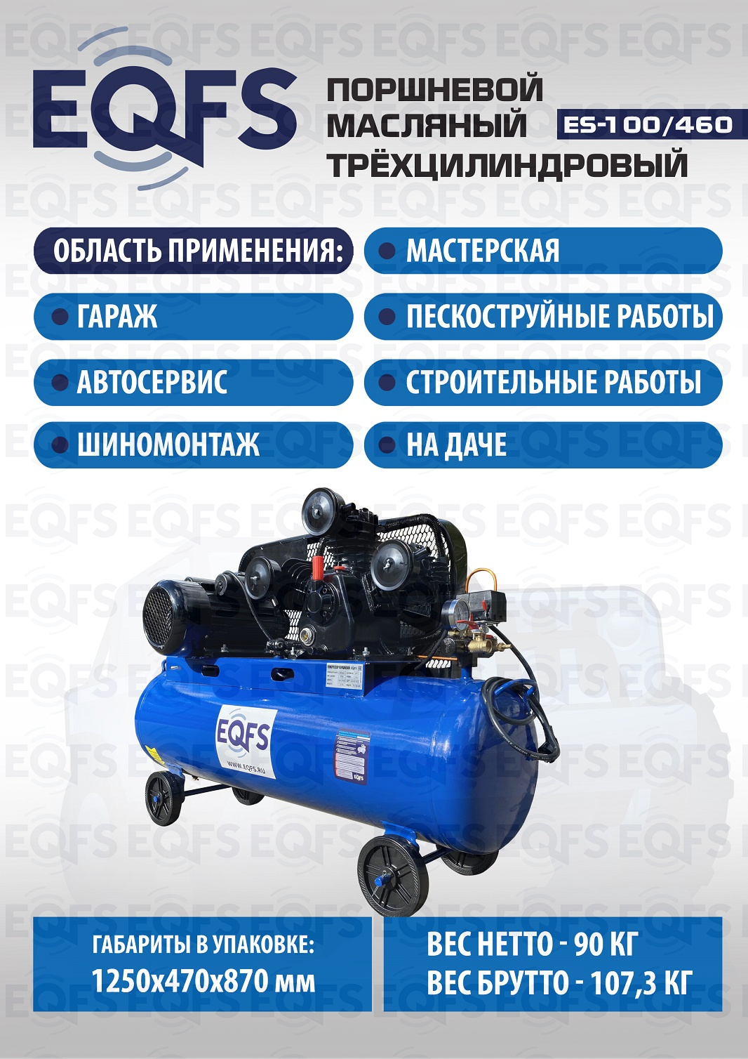 Компрессор воздушный, передвижной, поршневой, масляный, трёхцилиндровый. Быстро набирает давления. Трёхпоршневая головка двигателя уменьшает износ деталей и увеличивает срок службы. Ремённый привод — предохранят мотор от поломки. Идеальное решение для небольшой мастерской, шиномонтажа, автосервиса, гаража. Давление 8 Атм. Производительность 460 л/мин. Мощность 3 кВт. Напряжение 220В. Ёмкость ресивера 100 л. Гарантия 12 месяцев. Для корректной эксплуатации необходимо обеспечение мощности питающей сети с номинальным током 25А и напряжение 220V.