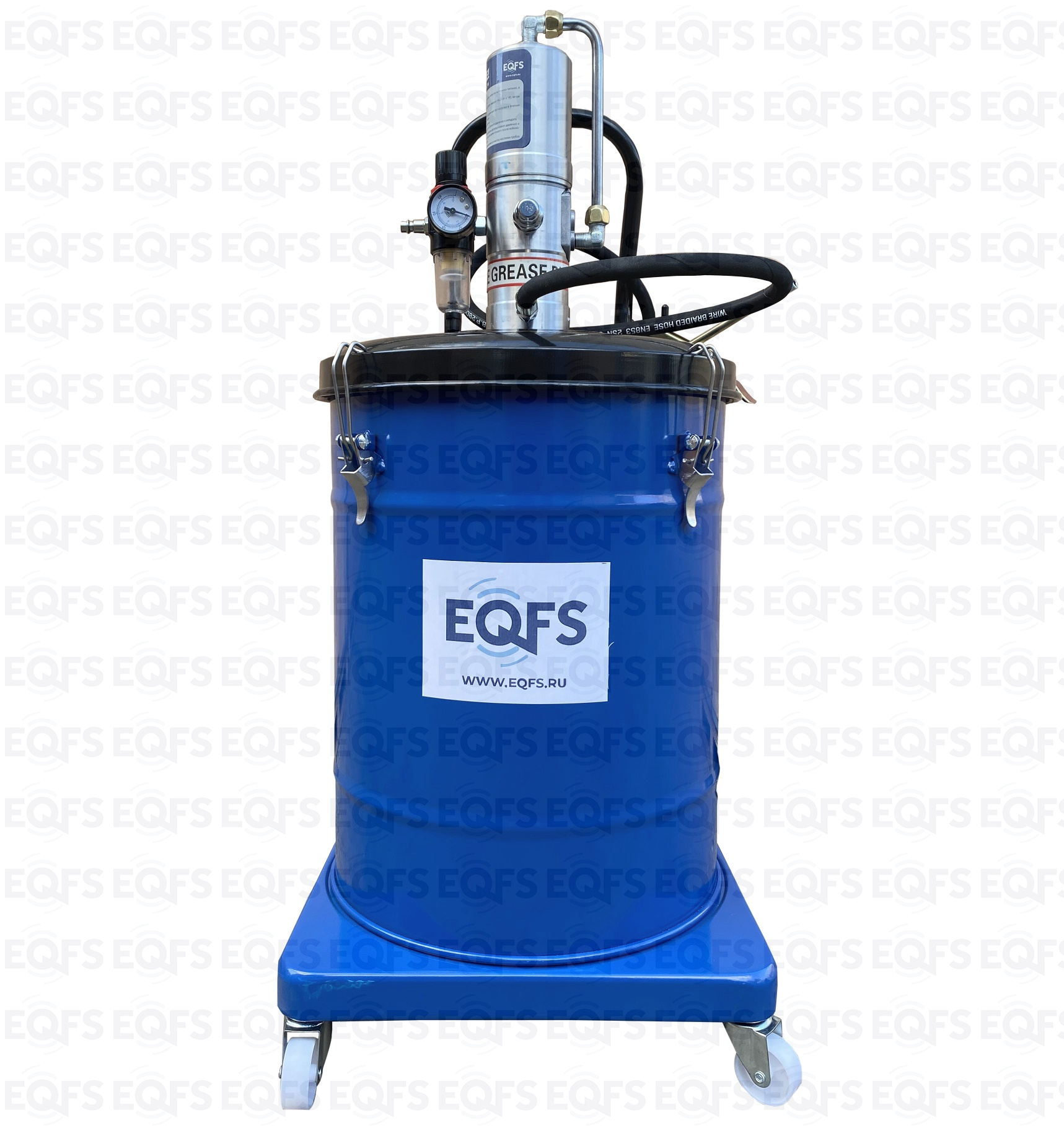 Корпус нагнетателя смазки – стальной, насос изготовлен из анодированной стали. Фиксация насоса с крышкой к баку для смазки производится с помощью металлических защелок с резьбой. Для удобства транспортировки нагнетатель оборудован металлической ручкой в верхней части корпуса. Нагнетатель оборудован маслобензостойким армированным шлангом длиной 4 м. Солидолонагнетатель для консистентной смазки, установленный на колесах, имеет легкий вес и экономичную конструкцию для удобства перемещения и эксплуатации.