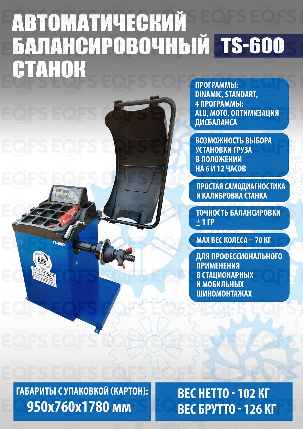 TS-600 Балансировочный станок автоматический. Автоматический ввод дистанции и диаметра диска. Остановка и фиксация колеса в месте установки грузика. Лазерная указка места установки грузика на 6 часов. Старт опусканием кожуха или с кнопки. Для колес легковых автомобилей, мотоциклов и легких грузовиков с диаметром диска с резиной до 800 мм. Размеры диска: ширина 3–10” (76-254 мм), диаметр диска 10–24” (254÷609 мм). Вал- 40мм. Гарантия 18 мес – наш монтаж, 12 мес – самостоятельная установка. В комплекте: кожух с автозапуском + клещи + кронциркуль + быстрозажимная гайка + набор конусов.