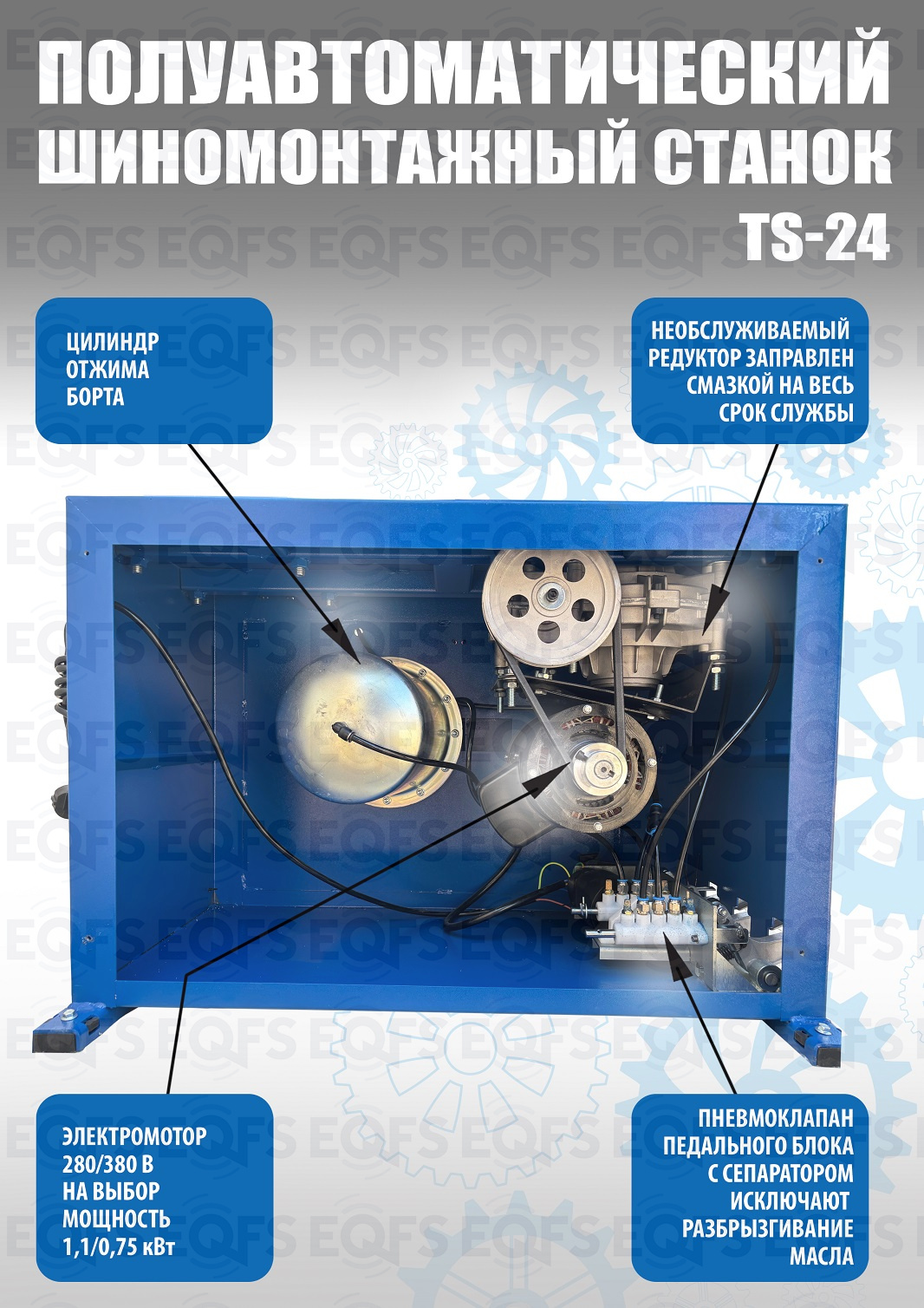 шиномонтажный станок TS-24. Полуавтоматический. Квадратный стол. Рекомендуется для постов со средней и высокой проходимостью. Для дисков: внешний 11÷21”, внутренний 12÷24”.  Усилие отрыва покрышки 2700 кг. В комплекте: пистолет для подкачки шин + монтажка + пластиковые накладки на зажимные кулачки + регулятор давления с влагоотделителем и манометром. Поставляем на 220В и 380В