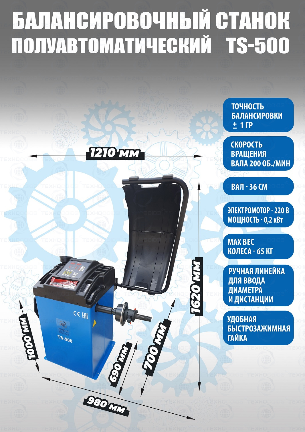 Полуавтоматический балансировочный стенд TS-500 для колес легковых автомобилей, мотоциклов и легких грузовиков с диаметром диска с резиной до 760 мм. Размеры диска: ширина 3–9” (76-228 мм) , диаметр диска" -  10–21” (254-533 мм). Вал-36 мм. Максимальный вес колеса с диском – 65 кг. C кожухом. Точность ±1гр. Напряжение 220В. . В комплекте: кожух с автозапуском + клещи + кронциркуль + быстрозажимная гайка + набор конусов